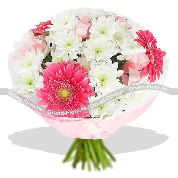 Стандартный: хризантема кустовая белая - 4 шт., гербера розовая - 3 шт., фетр розовый, лента.