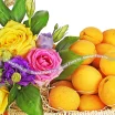 Уменьшенный: роза желтая - 2 шт., роза розовая - 1 шт., эустома фиолетовая - 1 шт., рускус - 1 шт., оазис, корзина малая, абрикосы - 1 кг.