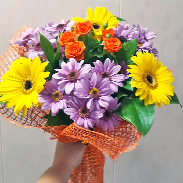 Стандартный (на фото): хризантема кустовая ромашковая (фиолетовая) - 3 шт, гербера желтая - 3 шт, роза кустовая оранжевая/розовая - 1 шт (в центре), рускус или салал, фетр оранжевый. Примерный размер: 25Х25 см.