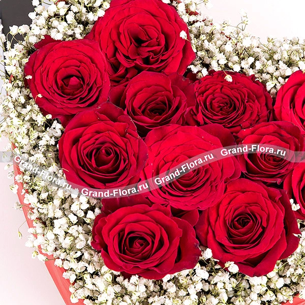 11 роз (на фото): роза красная - 11 шт., гипсофила, оазис сердце малое. Примерный размер: 25Х25 см.