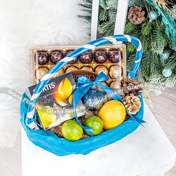 Уменьшенный: чай "Curtis"- 20 пак., конфеты "Ferrerro Roсher" - 200 гр., лайм - 2 шт., лимон - 1 шт., шишки - 1 шт., шарики - 1 шт., корзина малая.