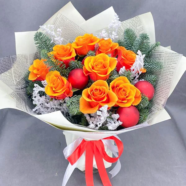 Этот новогодний букет из оранжевых роз просто потрясающий! Я никогда не думала, что оранжевые розы могут быть такими яркими и жизнерадостными. Они привнесли в мой дом атмосферу праздника!